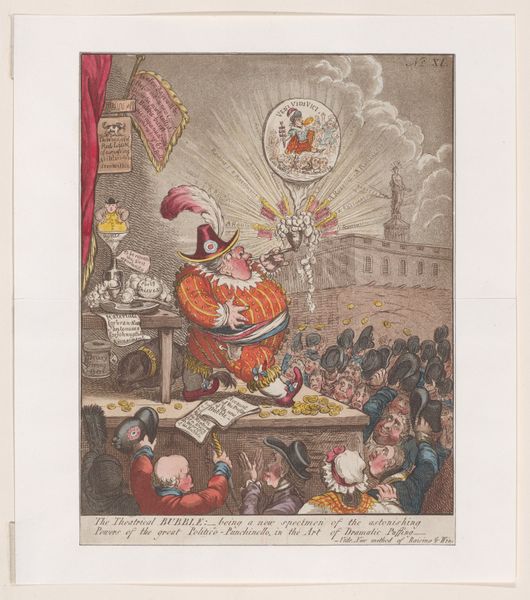 Editor: This is "The Theatrical Bubble" by James Gillray, an etching from 1805. The level of detail is just incredible, almost overwhelming. The composition feels satirical and definitely mocks someone, or something. What do you see in this piece? Curator: I see a powerful critique of theatrical and political spectacle. Gillray, operating during a turbulent time of war and social upheaval, uses caricature to expose the "dramatic puffing" – the empty promises and exaggerated rhetoric – of those in power. This print becomes a stage for deconstructing the manipulative tactics employed to sway public opinion. Editor: So, the figure blowing the bubbles, he’s not just some random entertainer? Curator: Exactly. He is “Politiico-Punchinello”, a puppet master figure. Notice the "bubbles" themselves. What do you observe about their content? Editor: They seem to have names on them... “A. Rossi”, “T.R. etc. It's like he’s blowing up these individual reputations. Curator: Precisely. And observe the audience—a sea of grasping hands and upturned faces. Gillray captures how easily the masses are seduced by spectacle, eager to consume even the most fleeting and insubstantial promises. How do you see this relating to contemporary society? Editor: It’s a bit disheartening. I think the hunger for celebrity gossip or political sound-bites are our current bubbles that distract from deeper issues. Curator: Precisely. Gillray’s satire endures because it exposes the timeless dynamics of power, propaganda, and the manipulation of public sentiment. It's a stark reminder to critically examine the narratives we are presented with. Editor: I’ll definitely look closer at Gillray’s other works now, and maybe consider who the Punchinellos are today.