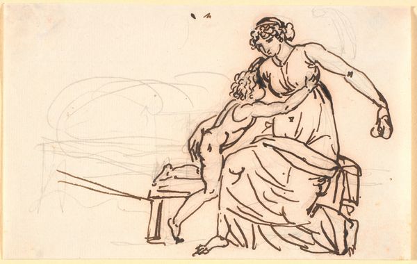 Editor: Here we have "Two Girls in Classical Dress," a drawing in ink on paper by Catharina Kemper, created around 1815. The delicate lines give it a somewhat fragile, ephemeral feeling. What do you make of it? Curator: It's interesting to see Neoclassicism manifested in a drawing, especially one focused on female friendship. The idealized forms, the classical garb – these were meant to evoke a specific vision of the past, one tied to civic virtue and order, largely dictated by male artists and patrons. But consider, who was Kemper drawing for? A different audience might receive this artwork. Editor: I see your point. It almost feels like she’s taking these classical ideals and imbuing them with a sense of intimacy and maybe even...domesticity? Was there an appetite at the time for artworks that reflected less grandeur? Curator: Absolutely! The rise of the bourgeoisie created a market for art that resonated with their values. Consider also the political context: Napoleon's defeat at Waterloo that very year signalled changes. Even in the wake of war and political restructuring there’s an undeniable sentiment of hope for a different order. But consider how this sentiment and "hope" exclude the feminine sphere. Editor: That is such a compelling interpretation, it hadn’t occurred to me! So much more to it than just two pretty faces! Curator: It is, after all, never just *two pretty faces.* The power dynamics, the societal influences… that's where the story truly lies. Editor: Well, I'll certainly keep all of that in mind next time I see a seemingly straightforward portrait. Thanks! Curator: Likewise, it is always rewarding to examine pieces like this in a new context.