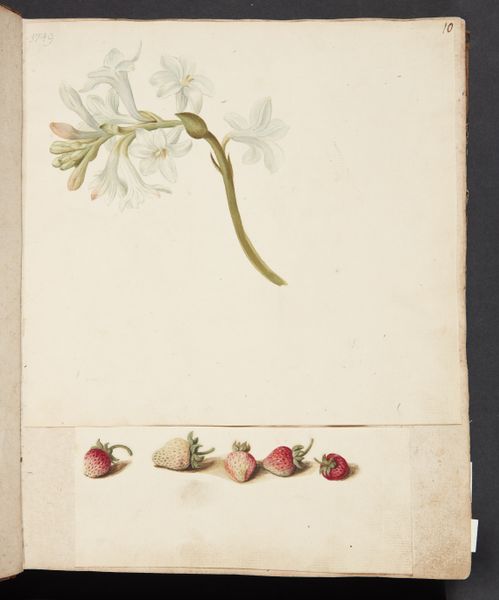 Editor: So, here we have Johanna Fosie’s "Study of a Flower in a Glass with Water and White Asparagus," created sometime between 1748 and 1759. It's rendered with colored pencil, gouache, and watercolor. It has this lovely, delicate feel… What symbolism or deeper meaning do you find in this image? Curator: It’s tempting to see the flower, bravely presented in a glass, as a symbol of transient beauty, right? Especially set against the fading asparagus. But consider the cultural context: flower painting in this period, particularly by women artists, often spoke to a quiet but powerful negotiation of status and knowledge. Editor: Status and knowledge? How so? Curator: The image may have operated as more than a pretty thing; through its intricate depiction, a whole history of the world is being displayed as if claiming some authority through observation. Why those specific flowers, in that specific vessel? Where did it come from, what does it represent? And why pair with asparagus? This juxtaposition evokes the cyclical, ephemeral qualities of both. Asparagus tips are a spring delicacy, quickly gone and thus precious; their depiction prompts reflection on nature's cycles of bounty and the fleeting moments we should savor. Editor: So, it's less about just the beauty of the flower and more about…understanding it, categorizing it, possessing a certain type of intellectual power. It changes how I see it entirely. Curator: Precisely! It’s about claiming authority over knowledge of the natural world. Every careful brushstroke embodies a larger conversation around botany, scientific accuracy, and feminine intellectual spaces. The drawing carries these symbols while questioning them. Editor: I see it now - thanks to your perspective I can feel how loaded this innocuous-looking still-life really is! Curator: Absolutely; hopefully now our listeners do as well!