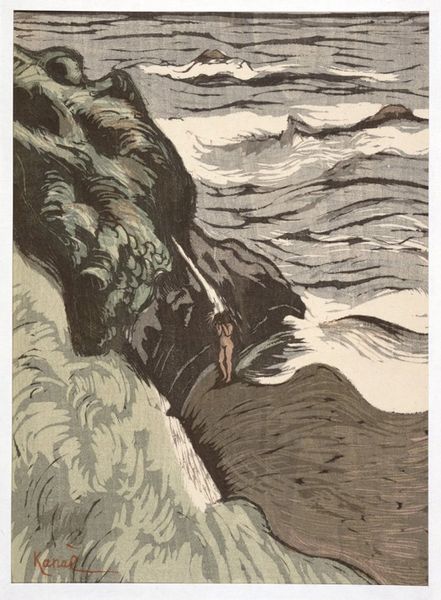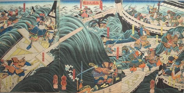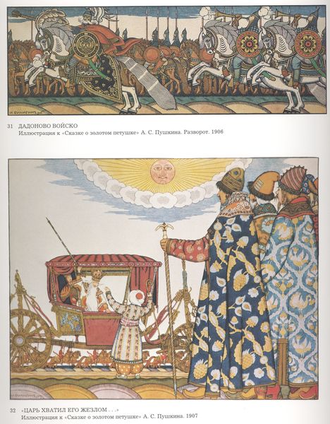 Editor: We’re looking at Ivan Bilibin’s “Illustration for Alexander Pushkin's 'Fairytale of the Tsar Saltan'” from 1905. It feels incredibly stylized, almost like looking at a theatrical stage set. The regimented lines of figures and bold colours definitely command attention. How do you interpret this work? Curator: Bilibin’s illustrations are so fascinating because they represent a conscious effort to create a distinctly Russian artistic identity. This piece, along with others from the same series, reflects the rise of national romanticism. Think of the time: turn of the century, growing sense of Russian cultural pride, and a desire to move away from purely Western European influences. How does this connect to broader cultural movements? Editor: You mean, like the Arts and Crafts movement's return to traditional crafts and designs? Is this similar? Curator: Precisely. It’s a similar impulse but rooted in a very specific Russian context. He's drawing heavily from folk art and traditional Russian ornamentation, while also borrowing from Art Nouveau’s linear style and Japonisme, and mixing it up with Russian Avant Garde elements to serve social, political, and cultural narratives. Consider how these visuals were used in a period of revolution. They provided ways for ordinary citizens to reflect and re-examine historical self-understandings and construct a political image for their own present-day issues. It gives you chills, doesn't it? Editor: It really does! I never considered the connection between national identity and artistic style so explicitly. I see now that it is not only for decor but also conveys something meaningful. Curator: And that understanding highlights how museums, exhibitions, and printed books featuring such imagery were instrumental in shaping public perceptions of Russian identity at the time. So the image's initial appearance is connected to sociopolitical changes. Editor: That’s a perspective I'll definitely keep in mind from now on! It really shifts my perception of how even illustrations have impact!