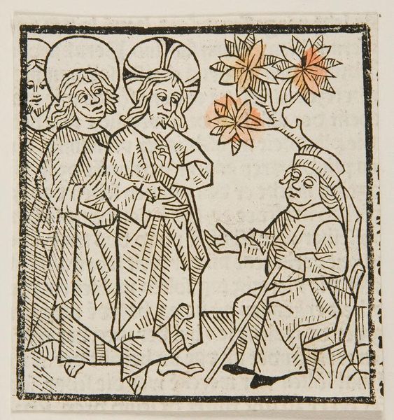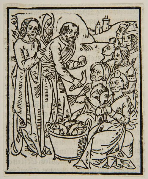 Curator: This piece, held at the Harvard Art Museums, is titled "Christ Healing the Lame Man" by an anonymous artist. Editor: The starkness of the black lines against the white is so direct, it's like a visual shout of immediacy. Curator: Indeed, the woodcut's visual language speaks to a collective understanding of the miraculous. Look at how the city in the background is almost secondary, stylized into symbolic form, dominated by Christ. Editor: And those flower-like shapes scattered around—are those meant to suggest nature blooming forth with healing? Curator: Precisely. They could represent an Eden-like return to wholeness or even the miraculous growth associated with divine intervention. Editor: It's a fascinating blend of simplicity and symbolic weight. A visual sermon, almost. Curator: Exactly, a testament to how symbols shape our understanding of faith and healing. Editor: Yes, art as a window into belief.