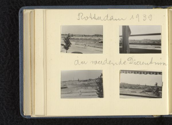 Curator: At first glance, it appears orderly, but undercurrents suggest melancholy. The contrast seems significant, between the neatly organized photos and what feels like underlying somberness. Editor: Yes, this albumen print from 1938 is titled "De buurt waar de familie Wachenheimer woonde, 1938, Rotterdam"—"The neighborhood where the Wachenheimer family lived, 1938, Rotterdam." This series of street photography intends to memorialize something on the verge of disappearing. Curator: Albumen prints have a fragile, ethereal quality—it mirrors that ephemeral moment of recognition that things are about to alter irrevocably. Does this fragility somehow echo that pre-war era? Editor: Absolutely. The choice of medium is telling, almost foreshadowing. Here we see a deliberate attempt to record not just a place, but an atmosphere pregnant with precarity for a specific community. Think about it: 1938. What visual signifiers within these pictures speak to the impending devastation? Curator: The lack of people. Wide streets but empty, lending an eerie quiet. Absence can signify erasure or displacement just as powerfully as any presence. They were living a precarious life and the photos capture that in some way, even subtly. Editor: Precisely. While presented as an urban landscape study, the visual silences carry the weighty context of impending social and political breakdown. Curator: How crucial it is to remember that even seemingly innocuous images bear coded cultural weight. They are artifacts speaking beyond their explicit representation, a function often invisible in traditional historical accounts. What would the Wachenheimer family make of these photos surviving today? Editor: Indeed. Consider photography’s capacity for both preserving and omitting narratives. What's presented here isn't just what exists, but also hints at what's being suppressed or soon will be, making the preservation even more important. These are powerful choices that speak directly to themes of memory, identity, and historical justice, particularly concerning marginalized communities. Curator: Thanks for drawing attention to this complex layering. These photos act like contemporary symbolic reliquaries reminding viewers of events both ordinary and historically charged. Editor: Agreed. Understanding this reminds us how personal and political archives can shape collective understanding. Thank you.