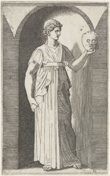 Curator: Looking at this image, I'm struck by the starkness of the engraving and the way light plays across the draped figure. There’s something so immediate in the contrasting blacks and whites. Editor: That's right. We’re looking at “Muse with Two Scrolls Standing in a Niche,” an engraving by Marcantonio Raimondi, created sometime between 1511 and 1520. It’s part of the collection at the Rijksmuseum. Curator: Raimondi’s process is remarkable; engraving requires incredible skill. Consider the labor and tooling involved in making marks on a copper plate. What level of training or guild was required to produce this? And who commissioned this engraving and why? Editor: Precisely. Raimondi was instrumental in popularizing reproductive printmaking. His workshop allowed for greater distribution of Renaissance ideals through imagery, which, of course, impacted artistic taste at the time. Note how prints were consumed; the elite owned books, prints were tacked on walls—a whole other realm of consumption. Curator: And this reproduction of Raphael. She seems like a classical sculpture come to life; look at her idealized features and contrapposto stance. But more so I wonder who decided this image was worthwhile reproducing at the time? What type of institutions are making choices and how might this figure stand as an example? Editor: I am not so sure about Renaissance ideals exactly – engravings democratized images, bringing high art within reach of those outside elite circles. That has its own subtle socio-political power; suddenly, aesthetic values are something anyone could theoretically obtain, although economic structures certainly created uneven distribution. What does mass production enable or foreclose? Curator: Absolutely. The distribution shapes its impact, transforming a work accessible by so few into something within reach of, though probably not fully grasped by, many more. This reproduction raises significant issues about patronage, value, access, and how images shape taste—and in turn, behaviors, even! Editor: Indeed, this print’s story reveals not just Renaissance art but also the beginning of art's journey into the public sphere. Curator: Thinking of its modern impact and historical setting, the impact of this one object truly remains boundless! Editor: The convergence of aesthetic vision, labor, socio-economic, and historic conditions all come to together for each and every piece we study.