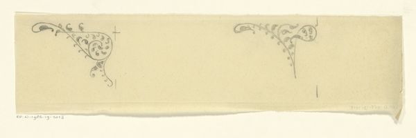 Curator: This is "Ontwerp voor een ornamenteel kader," or "Design for an Ornamental Frame," attributed to Reinier Willem Petrus de Vries, created sometime between 1884 and 1952. It’s a pencil drawing on paper. Editor: My first thought is how delicate it appears, almost like looking at a forgotten fragment. The brown paper gives it an aged feeling, contrasting the lively swirls of the pencil work. Curator: Indeed. This piece gives us a glimpse into the design process of decorative arts. Vries likely intended this as a study for a larger work, possibly architectural or furniture related. Ornamentation during this period often drew upon historical styles, incorporating them into contemporary designs. Editor: Looking at the organic shapes intertwined with more geometric forms, I wonder if this frame design was intended for something that blurred the lines between art and utility, reflecting a larger movement to integrate aesthetics into everyday life? I'm also interested in what messages frames transmit through ornamental meaning. What kind of narratives are historically imposed by design like this and what purpose does it serve? Curator: It's an excellent question. Consider how institutions use similar frames to enhance their self-representation by influencing how people engage with art through a specific design language that expresses its social status. And speaking of form, one must remember the role of Art Nouveau and the broader aesthetic context, especially when understanding the role of beauty within complex political climates. Editor: Absolutely. By understanding what's being emphasized aesthetically, the narratives that such frames impose begin to reveal deeper issues that speak to gender, power, and privilege. For example, could we interpret this as challenging conventional understandings of identity or as promoting inclusive aesthetics? Curator: While those are pertinent and useful observations, such claims would likely depend on the artwork ultimately framed and displayed using this sketch. Editor: Yes, exactly. Ultimately, as scholars we are responsible for creating dialogue between historical design choices and critical discussions that challenge dominant art spaces and social norms. Curator: I agree. A close look reminds us of art’s broader cultural implications and the power embedded within designs like these. Editor: Precisely, and reflecting on this also enriches our understanding of both the artist and the larger art landscape.