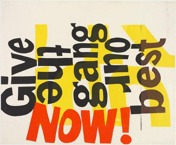 Editor: This is Rosalyn Drexler’s "Study for Men and Machines I," painted in 1965 using acrylics. The stark yellow background and flattened figures give it a graphic quality that feels both detached and intriguing. I’m really drawn to the composition, how it balances human presence with the looming machinery. What catches your eye in this piece? Curator: The piece immediately places itself within a specific cultural moment, the mid-1960s, with its anxieties and celebrations of technology. Drexler seems to be questioning the evolving role of men in a society increasingly dominated by machines. Note how the men are somewhat flattened, almost becoming part of the machine itself. This was the height of the Cold War, when the idea of technology and mechanization was highly loaded. Does that read to you? Editor: Definitely. They almost seem absorbed by it, or maybe even replaced by it? Like they are now extensions of the machine rather than the other way around. Curator: Precisely! The Pop Art aesthetic flattens the hierarchy between man and machine, echoing the concerns about mass production and conformity pervasive at the time. Think of the ways factory workers or office workers were considered anonymous members of a much larger, less-human organization. The painting highlights the complex dynamic where technological advancement simultaneously empowers and potentially dehumanizes individuals within social and economic structures. Consider how art reflects those shifting power dynamics and its influence on a viewing public. Editor: That makes so much sense. Seeing it in that historical and social context really deepens the impact. Curator: Exactly. Understanding art means engaging with its historical implications, how it both reflects and shapes cultural perceptions and power structures. It makes me wonder how contemporary artists approach similar issues of technology and social change. Editor: Me too! Thanks, this was so insightful!