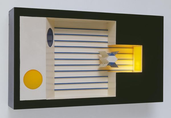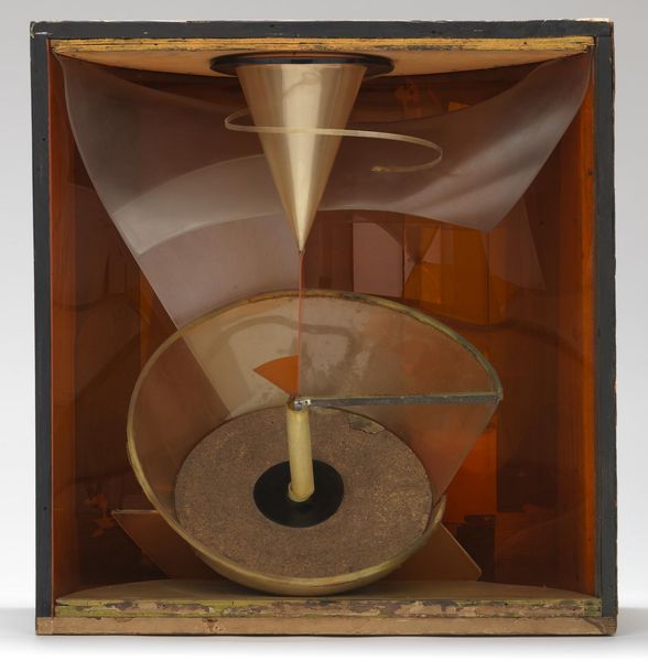 Curator: Naum Gabo, born in Russia in 1890, presents here his "Model for 'Double Relief in a Niche'". It's currently housed at the Tate. Editor: It strikes me as a stage, maybe for a play about…mechanization. I’m getting a quiet, unsettling feeling from the geometry. Curator: Gabo's work is so often about space and modernism, about breaking down barriers – both physical and ideological. Note the industrial materials and how the shapes interact. It challenges traditional notions of sculpture. Editor: And what could the niche represent? Is it a sanctuary or a cage? The symbolism feels ambiguous. Curator: Perhaps the niche is not a confinement, but a designated space for the future to unfold, to question what is art and what is its function. Editor: A provocative, open-ended question indeed. Thank you for your insights. Curator: My pleasure. This construction really makes us question our place in the modern world.