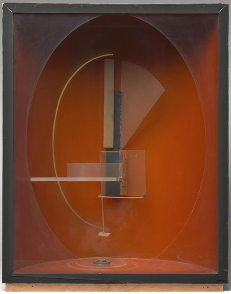 This model was made for a relief commissioned by the architect Eric Mendelsohn for his Berlin home in 1929. The relief was abandoned because the curved glasswork was too expensive. A drawing shows that it would have been three or four feet high, set into a wall above a sofa. The white plastic in the model represents the wall. The different forms and materials suggest the variety of ways in which Gabo sought to animate the internal space of the niche. Gallery label, August 2004