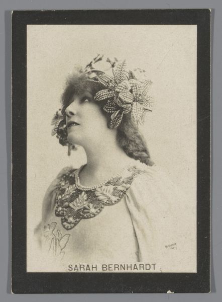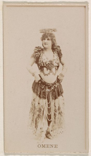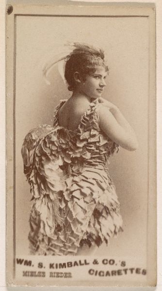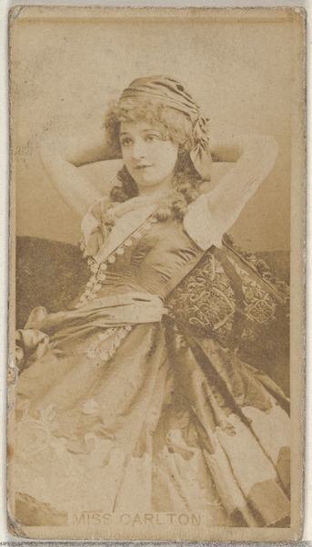 Curator: Well, if that isn’t the past served up in sepia! This is Lizzie McCall, from the Actors and Actresses series, produced between 1885 and 1891 by Allen & Ginter for Virginia Brights Cigarettes. Editor: My first thought? Opulence meets… discomfort? All those flowers plastered on what looks like a very restrictive corset. You can practically smell the perfume battling the tobacco. Curator: Exactly! These cards were tucked into cigarette packs as collectible premiums. Think of them as early forms of celebrity endorsement meets…ephemera. Editor: Ephemera with a wink, wouldn't you say? The photography and print medium underscores the mass production angle—glamor commodified, shrunk down, and slipped into your daily smoke. Curator: True! And the floral motif might speak to Victorian notions of feminine beauty. There's this idealized fragility, offset by the very real presence of Lizzie, an actress working and being marketed. The blend is poignant. Editor: That offset’s fascinating. This card flattens a woman, Lizzie, into pure visual culture, right? Consumed right alongside the very stuff shortening peoples’ lives. Does art gain or lose power amidst all this dark and calculated intention? Curator: A superb question. I suppose art gains relevance in how it both obscures and reveals human nature under industrial and market pressure. Think of it, this little thing contains aspiration, fantasy, exploitation... Editor: And labor—both Lizzie’s and those anonymous hands making the cards and packaging! I always circle back to the means. Who touched this? And what did they get out of it? That history is invisibly printed here. Curator: Absolutely. It reminds us how entwined pleasure and commerce were, and are, blurring the lines between performance, marketing and identity. Quite resonant with today, in many ways. Editor: Resonant indeed! A miniature monument to our complex relationship with desire, display, and consumption. Okay Lizzie, you’ve given me a lot to think about.