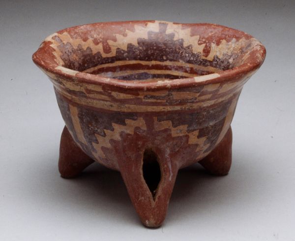 Editor: Here we have an earthenware bowl made by Mississippian peoples sometime between the 10th and 12th centuries, currently held at the Minneapolis Institute of Art. The geometric patterns feel quite modern, despite its age. What can you tell me about this piece? Curator: This bowl offers a powerful connection to the Mississippian culture, inviting us to consider their worldviews and social structures. The geometric designs are not just decorative; they are laden with symbolism, possibly referencing cosmology, the natural world, or social roles within the community. How do you think this object may speak to issues of Indigenous representation today? Editor: That's interesting. I hadn't considered its modern relevance. In terms of representation, it feels important to showcase Indigenous artistry outside typical museum contexts—blurring the lines between craft and art. Curator: Precisely. Recognizing these objects as more than just artifacts challenges colonial narratives that often relegate Indigenous cultures to the past. The material itself, earthenware, speaks to a relationship with the land—resourceful usage. Does the fragility of the medium play into your understanding? Editor: Yes, there's something incredibly vulnerable about its existence through time, giving it an intimate feel, despite being behind glass. The craftsmanship evident in its design highlights ingenuity and expertise. Curator: It prompts important questions: Who had the skills to make it? What role did this vessel play in daily life, or in ceremonial practices? Consider this in light of contemporary discussions about whose stories are told and how objects from marginalized communities can become agents of cultural preservation and resistance. Editor: Seeing it through this lens really brings a new appreciation, highlighting its significance in preserving and celebrating Indigenous identity. I see now that there are stories waiting to be uncovered in unexpected places, reframing narratives around marginalized cultures. Curator: Exactly, it shifts from being just an object to being a testament of cultural continuity and resistance, urging us to challenge existing norms.