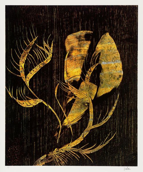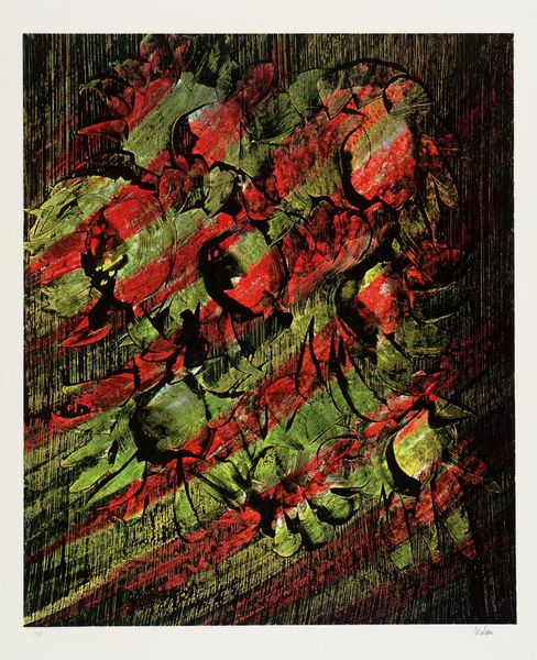 Curator: This is "Print 14" by Sir Sidney Nolan, part of the Tate Collections. I find it intensely evocative, almost visceral. The colour palette strikes me first. Editor: Yes, the stark reds against that almost bruised-looking dark background create a palpable tension. It's hard to ignore the inherent political statements embedded in art using such dramatic colour choices. Curator: Nolan, born in 1917, often explored themes of Australian identity and mythology. Considering that context, one might ask how this intense visual language intersects with representations of land, belonging, and perhaps even dispossession. Editor: Absolutely. And the repetitive, almost woodgrain-like texture in the background... it speaks to the physical labour, perhaps even the exploitation, that is so often intertwined with land ownership and resource extraction. It's not just a pretty picture, it's a statement. Curator: Indeed, engaging with the artwork through such lenses allows us to reflect on the politics of imagery and its enduring relevance to contemporary discussions around identity and place. Editor: It's a powerful reminder that art is never created in a vacuum; it's a product of its time and continues to resonate with the social and political issues of today.