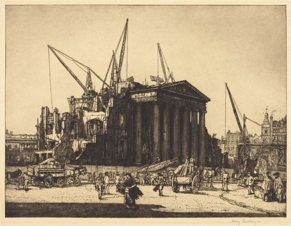 This is Muirhead Bone's "The New Strand," an etching, of uncertain date. Etching is an indirect process, a cousin to drawing. The artist covers a metal plate with a waxy ground, draws through it with a needle to expose the metal, then immerses the plate in acid. The acid bites into the exposed lines, creating grooves that will hold ink. Here, Bone uses the etching technique to capture the dynamism of urban construction. The lines are hatched and cross-hatched, mirroring the dense scaffolding that dominates the scene. Look closely, and you'll notice the figures of laborers perched high on the structure, dwarfed by the scale of the project. The choice of etching emphasizes the gritty reality of the building site, a world of labor far removed from the refined elegance often associated with fine art prints. Consider the social context: Bone made this work during a period of rapid industrialization and urban renewal. By focusing on the process of construction, he acknowledges the sheer effort involved in shaping the modern city. This challenges the traditional hierarchy separating "high" art from the realities of everyday life and labor.