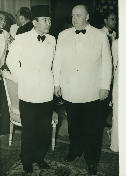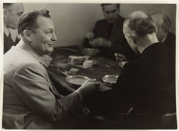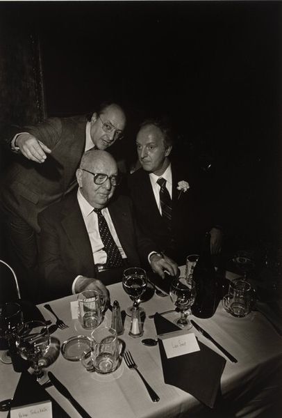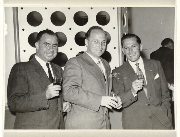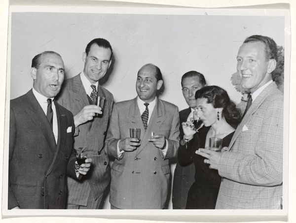 This photograph, ‘Gideon Elon met een roos in zijn revers lachend in gesprek met een onbekende man, tijdens een receptie gedurende de KLM-tijd van Isabel Wachenheimer,’ captures a moment, probably during Isabel Wachenheimer's time at KLM. Made by an anonymous photographer, it's like a quick sketch in monochrome. The beauty of a photo like this lies in its stark simplicity, the way it freezes an instant. The rose in Gideon Elon's lapel, for example, is a splash of form that brings a kind of depth. The whole image is a mix of textures: the smoothness of the glass, the patterned fabric of the suit, and then those half-empty bottles, so full of potential stories. Thinking about the photographer who took this, I wonder about their own story, their process. The picture feels like a fragment, a tiny piece of a much larger puzzle, almost like something that Lee Friedlander might have captured. There's a sense of mystery, of untold tales, inviting endless interpretations.