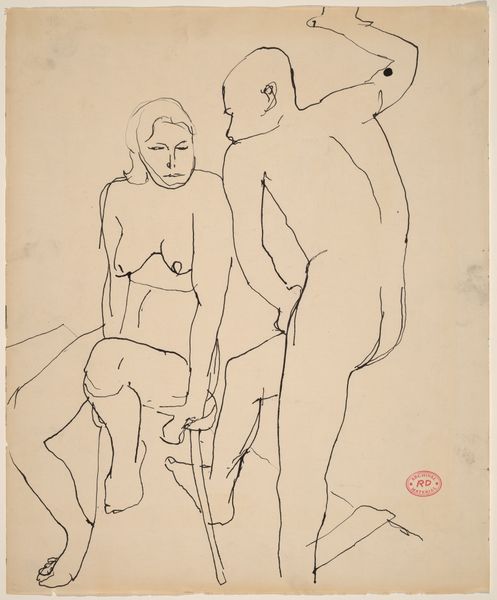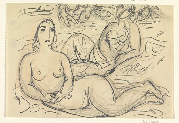 Editor: Here we have "Zwei Mädchenakte vor einem Bildnis," which roughly translates to Two Female Nudes before a Portrait, a drawing by Ernst Ludwig Kirchner around 1910. The raw, sketchy quality gives it a very immediate, almost urgent feeling. What stands out to you? Curator: This drawing speaks volumes about the social and artistic circles Kirchner inhabited. Consider the quick, almost furtive nature of the lines; what kind of paper was readily available and inexpensive? Whose time was being spent and under what pressures? It hints at the working conditions, the very material circumstances in which this piece came into being. The apparent "roughness" is not just stylistic, it is born of labor and economics. Editor: So, you're saying the materials themselves reflect something deeper about the time? Curator: Exactly. The drawing isn't simply a representation of two nudes and a portrait. It embodies a whole network of relations – Kirchner’s access to materials, the model's time, even the purpose and eventual consumption of the art itself. What do you imagine those factors were in Dresden in 1910? Were these casual studies, or preparatory drawings for something more 'high-art'? Editor: That’s fascinating! I hadn’t considered the type of paper, pencil and ink as having any real significance, other than for, you know, just putting marks on the paper. It does make you wonder about who these figures might have been as well... Curator: Precisely. Thinking materially allows us to break down traditional hierarchies that position "art" as separate from the everyday realities of production and consumption. By considering labor and economic relations you ask critical questions of how "fine art" itself is constructed. Editor: I’m beginning to see it differently now. Looking closely at artmaking with these issues in mind does makes it much richer and challenging. Thanks.