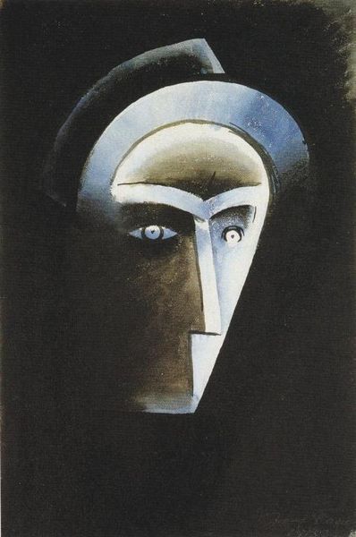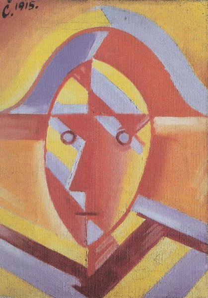 Editor: This is "Man with a Moustache" by Josef Capek, painted in 1915 using oil paint. It's strikingly geometric and, honestly, a bit unsettling. What do you make of it? Curator: Unsettling is a good word for it. This portrait is like a visual puzzle, isn't it? Capek, steeped in both Cubism and Expressionism, utilizes simplified shapes—the triangle for the nose, circles and slits for the eyes—to create a face, yet it’s a face that feels deliberately deconstructed. Editor: It's hard to connect with. I almost see it more as a symbol of a man than a true likeness. Curator: Exactly! Capek is digging beneath surface appearances. Notice the colours – the muted palette. What do they suggest to you in terms of the man’s character or state of mind? Editor: Somberness, maybe? A sense of weariness? Curator: Precisely. These aren't joyous colours; they evoke a certain heaviness, perhaps reflecting the anxieties of the pre-war period. This is a face stripped down to its basic elements, almost like an archetype rather than an individual. He represents Everyman facing some sort of existential crisis. The moustache almost seems a mocking, old fashioned virility sign. Editor: So the geometrical forms and muted tones are working together to convey more than just a visual representation? Curator: Absolutely. They become symbols themselves. A geometrical prison almost. We read that image as being very human, but, rendered as lines and shapes, it transforms and speaks in symbolic shorthand. It invites us to consider what it means to be human and individual. It questions memory of cultural identity during wartime. Editor: That’s fascinating. I'll definitely look at other portraits differently now. Curator: It shows us that even in what seems like abstraction, profound meaning resides and collective ideas are at play.