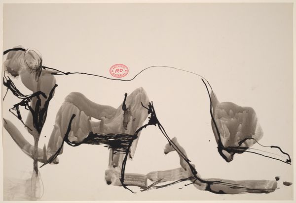 Curator: Here we have Dame Elisabeth Frink's "Lying Down Horse," now part of the Tate Collections. Editor: It’s incredibly graceful, almost languid. The loose strokes give it a sense of movement, despite the horse's resting pose. Curator: Frink, born in 1930, was deeply affected by the anxieties of the Cold War and the ever-present imagery of conflict. This is interesting given the simplicity of this work. Editor: Horses, throughout history, often stand as symbols of power, virility, and freedom. But here, the horse seems to embody vulnerability, maybe even weariness. Curator: Frink often challenged established sculptural norms, prioritizing emotional impact over precise anatomical representation. Her work often reflects concerns around social and political themes. Editor: The horse's gentle curve and averted gaze evoke a sense of introspection. It makes you wonder what burdens it carries, symbolically speaking. Curator: Indeed, a reflection perhaps on the cost of power. Editor: A poignant thought. I appreciate how Frink manages to convey so much with such understated elegance. Curator: It encourages a deeper consideration of the weight of historical and cultural symbols. Editor: Absolutely, it's a powerful piece that prompts us to reconsider familiar iconography.