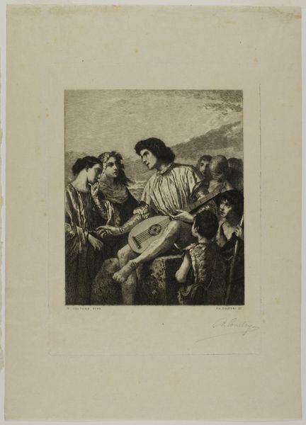 Curator: Ah, this piece exudes such quiet melancholy! What a world of emotion is captured in shades of sepia. Editor: Indeed. What you are observing is "The Minstrel," an 1873 etching by Charles Louis de Courtay, currently residing here at The Art Institute of Chicago. Its primary composition includes line, form, and the considered use of negative space to imply shape, but it appears like an almost-blurred fresco. Curator: A minstrel, caught mid-performance, surrounded by onlookers. I imagine him sharing tales of knights and dragons or perhaps even the pangs of unrequited love. And these are probably those swooning women so typical to see at the troubadour concerts. All the same! the energy feels dreamlike... Editor: Notice how Courtay uses varying densities of hatching and cross-hatching to render the figures. Look closely; some faces emerge from shadow more distinctly than others, a deliberate tactic to suggest spatial depth using tone instead of linear perspective. In semiotic terms, it invokes Romanticist themes without obvious cultural cliches like landscapes of ruins. Curator: But beyond technicalities, look how light glints on his lute, drawing you into his world of song! He isn't smiling. Are those happy memories he is playing with such nostalgia, or does it hide something sinister? Or perhaps the girls are simply mesmerized by that instrument that surely looks like the finest lute in all the kingdoms around it. Editor: Observe too the relationship between line and light in articulating musculature. De Courtay does not seek photographic realism; rather, he employs loose contouring to give the impression of idealized masculine vigor contrasted against soft female features around the character. What appears soft still relies upon very structural form work. Curator: It certainly gives voice to hidden emotion, though, don't you agree? It is hard to be too stern and clinical about this romantic scene from another time. Editor: Fair enough! From a formal view or from the narrative one you may see, this drawing proves how artwork creates enduring connections throughout the centuries. Curator: Exactly! Next drawing, please! I wonder what secrets they reveal...