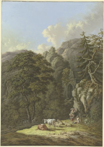 Friedrich Rauscher made this landscape, "Waldtal mit Blick auf eine Burgruine", using delicate gouache on paper. The opacity of gouache lends itself to the depiction of textures, like the foliage of the forest and the rough stone of the castle ruins. The paper support provides a smooth ground, allowing for fine detail in the rendering of the figures and animals. Gouache, with its matte finish, invites close inspection. Consider how Rauscher uses this medium to create a layered composition. The forest scene is placed in the foreground, leading the eye towards the crumbling castle. The detailed rendering of the shepherdess and her animals contrasts with the soft, atmospheric treatment of the distant ruins. This kind of pastoral scene speaks to the social realities of the time, reflecting the relationship between the land, labor, and the symbols of feudal power. Paying attention to the materials and making of this gouache deepens our understanding of its historical and cultural context. It prompts us to move beyond traditional categories of art.