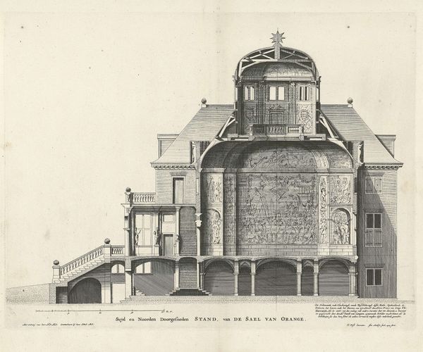 This detailed view of the Huis ten Bosch Palace was crafted by Jan Matthysz using engraving, a printmaking technique that demands precision and skill. The fine lines etched into the metal plate, likely copper, create a monochrome image that emphasizes form and structure. Engraving is not merely a reproductive process, but an interpretive act. The engraver must translate the three-dimensional world into a two-dimensional image, line by painstaking line. This image speaks to the status of the palace and its commissioner, because the act of engraving in itself was labor-intensive and costly, marking it as a luxury item. By documenting the palace in this way, Matthysz participated in the cultural and political work of solidifying its image. The level of detail, the clean lines, and the medium itself, elevated this depiction from simple representation to an emblem of power and prestige. It reminds us that materials, making, and context are crucial in understanding art's full meaning.