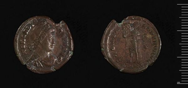 Curator: What a find! Here we have a Half Follis of Justinian I, minted in Thessalonica. It's a small bronze coin, but it carries a tremendous weight of history. Editor: It looks so worn and humble, doesn't it? A far cry from the grand visions of empire it once represented. It makes you think about power—how it circulates, and how easily it erodes. Curator: Absolutely. The coin features Justinian himself on one side, and a large "K," indicating its value, on the other. The artistry is simple, yet effective. Editor: And that simplicity speaks volumes. The very act of mass-producing these images, these symbols of authority... it’s a form of propaganda, embedding power into the everyday. Curator: I suppose in some ways, it worked. Though seeing the coin, almost as if unearthed yesterday, really underscores the endurance of art. Editor: Or perhaps, the enduring power of symbols. Food for thought, indeed.