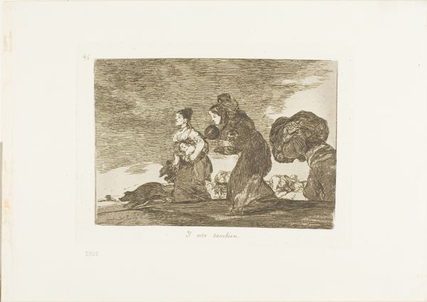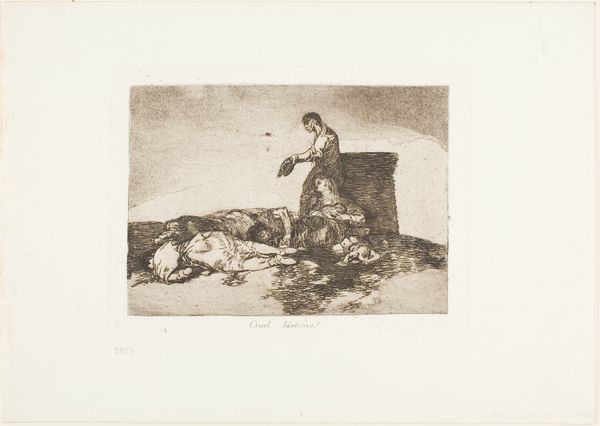 Curator: Good morning. Today we’re looking at plate 59 from Francisco de Goya’s *The Disasters of War*, a series of etchings, titled, "What is the Use of a Cup?". This piece resides here at the Art Institute of Chicago, and was likely created between 1812 and 1863. Editor: The initial impression is stark. There is an immediate feeling of desolation rendered through what appears to be a minimal composition. It is incredibly affecting. Curator: Goya's work here is striking for its raw emotional power, achieved through stark contrasts and dynamic lines. Note the figures huddled together; the tangible manifestation of their suffering is created via Goya's conscious manipulation of light and shadow to emphasize the figures’ skeletal forms, drained of life. Editor: The cup held by the figure in the background looms large, almost an icon of futility and helplessness. It’s reminiscent of earlier Christian symbols, particularly in how the background figure extends her hands—recalling images of mercy and saintly ministry amidst devastation. The implication here is deeply pessimistic though; the hope associated with these earlier images is obviously gone. Curator: Absolutely, this particular print utilizes form to intensify the theme of despair, specifically through its deployment of emptiness. Observe how Goya employs severe tonal gradations, focusing on an almost brutal simplicity that conveys the abandonment. Notice that the human figures comprise but a small fraction of the image. This creates negative space that amplifies the vast desolation in which this scene transpires. Editor: In considering Goya’s recurring symbols of famine and the visual allusions to mercy, one cannot help but imagine him wrestling with themes of failed compassion, the inadequacy of sustenance, and the disruption of foundational communal beliefs by the relentless cycle of conflict. Curator: Yes, and structurally, there’s the rough, almost chaotic etching technique itself. Goya uses the physical process to mirror the brokenness and disorder he's depicting. Editor: Reflecting on its historical and symbolic resonance allows one to connect on an empathic level to human calamity—something eternally, sadly, relevant. Curator: Agreed, observing how the composition conveys these thematic anxieties proves invaluable to our understanding.