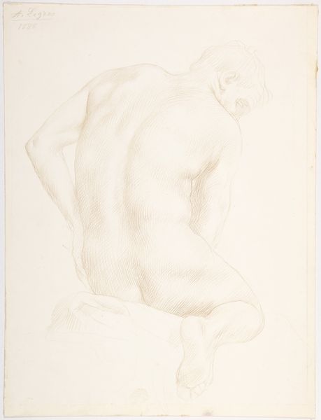 Editor: This is Denman Waldo Ross's "Kneeling Male Nude." It's a drawing, and I find its unfinished quality quite arresting. What do you see in this piece? Curator: The pose and the figure's obscured face evoke a sense of shame or introspection. The kneeling position historically symbolizes repentance or supplication, while the lack of distinct facial features universalizes the figure's emotion. What emotions do you interpret from this iconography? Editor: I guess I see a figure grappling with something internal, perhaps a moral dilemma. It feels very personal. Curator: Indeed, the drawing's incompleteness adds to this feeling of vulnerability, inviting us to project our own experiences onto the figure, echoing archetypal struggles. Editor: I hadn't considered the universality of it before. Thanks! Curator: And I appreciate your initial emotional response to the work.