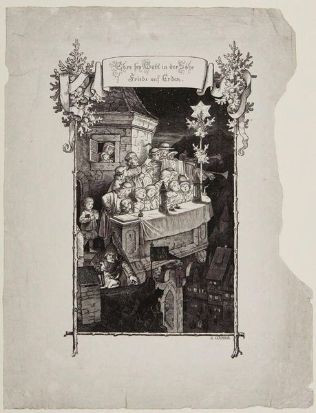 Curator: This textile work, "Puppet Theatre" by Aladar Korosfoi-Kriesch, dates back to 1907. Its quaint, storybook aesthetic immediately struck me. Editor: It's quite charming. The texture makes it look homespun, as if crafted by hand within a domestic environment. It radiates warmth, a sort of comforting aesthetic naivety. Curator: I agree. And I believe that feeling is intentional. Korosfoi-Kriesch was very involved in arts and crafts movements seeking to elevate traditionally marginalized art forms. Editor: This looks to be an outstanding example. How would the act of weaving fit into Korosfoi-Kriesch's political and social convictions? Was the piece intended for bourgeois consumption? Curator: It's difficult to say definitively. Tapestries were being revived for both bourgeois homes and public spaces. However, the labor invested in the craft inherently pushed back against mass-produced commodities. The figures depicted feel folk-inspired. Editor: Absolutely. It has that stylized simplicity. Tell me, how might the theatrical presentation being attended by an audience relate to discussions on artistic interpretation? Curator: That’s an interesting line of inquiry. Considering this as part of a broader attempt to bring fine art and craft together makes sense; to me, this work presents the democratization of culture by representing an entertainment available and appreciable by all levels of society. Editor: So the social message lives through accessible materiality as well as a readily legible, universally recognized narrative form. This dialogue between medium and meaning is fascinating, suggesting this tapestry wasn't only decorative. Curator: Precisely. Korosfoi-Kriesch is prompting us to look at where, how, and for whom art is produced. The intentional simplicity belies a sophistication in how it addresses artistic values. Editor: The tapestry compels me to appreciate not only its overt depiction, but also how its production embodies and supports certain artistic ideals, social inclusivity through accessible artmaking. Curator: Absolutely. The piece leaves us pondering not just art’s story, but whose story gets told through art, and in what material form that narrative takes shape.