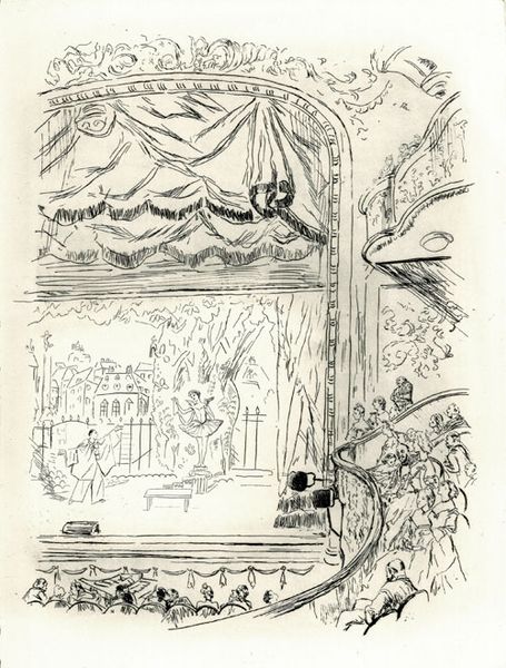 Curator: This pencil drawing by Pablo Picasso is titled "Tricorne" (study), and dates back to 1919. It offers us a fascinating glimpse into Picasso’s creative process. Editor: It has a fragmented quality. You can sense the flurry of activity suggested by these figures, almost a rehearsal caught in its early stages. The medium amplifies that feeling of raw potential, doesn't it? Curator: Absolutely. Look closely at the stark contrast between the rapidly sketched lines depicting the figures and architecture, against areas like the table in the foreground where the application of shade is more considered. I find it so evocative of the period, caught between the avant-garde drive for abstraction and more classical forms. The materiality of the paper itself— the tooth of it visible through the pencil— speak to its nature as a study. Editor: It reminds me of the Ballet Russes productions that Picasso was working on at the time. He wasn’t just a painter; he designed costumes and sets. How did his immersion in that world of spectacle influence his work here, do you think? There's a palpable sense of theatre, almost as if he were arranging figures on a stage. And note how class differences manifest: is that an authority figure watching an ostentatious show? Curator: It certainly appears so, a bullfight in the background, viewed from an elevated vantage. This study acted as preparatory design for "Le Tricorne", the ballet. A theatrical piece inspired by Spanish culture. And for what class of consumption, what gaze? One might view Picasso's engagement here through the lens of appropriation. He actively sourced various means of artistic making that served his ambitions. Editor: He borrows and repurposes with such fluidity, shifting contexts. Picasso’s art was deeply affected by the atmosphere and the post-war surge for avant-garde imagery. This seemingly simple pencil sketch pulls so much social, cultural, and material information from its time. It’s like a visual manifesto, the seeds of a movement on paper. Curator: Exactly. Examining its processes and how he engaged within the material conditions, the "Tricorne" study offers us insight not only into Picasso’s hand but into the mechanisms of culture and society itself. Editor: An evocative image brimming with questions.