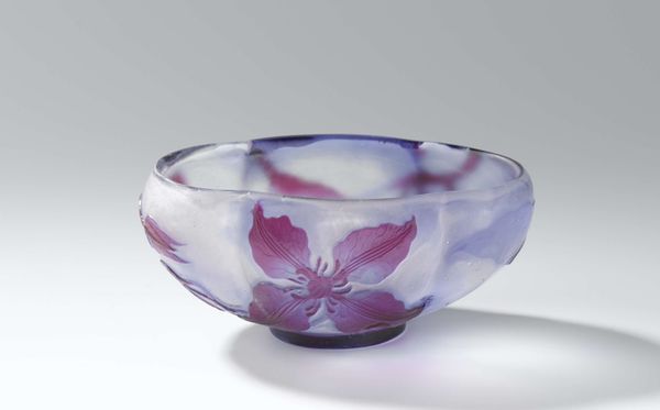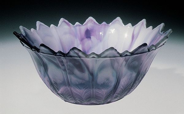 Curator: Before us is an elegant glass "Sauce Dish", made by the Challinor, Taylor and Company sometime between 1870 and 1890. It resides here at the Metropolitan Museum of Art. Editor: Mmm, "sauce dish," you say? It makes me think of enchanted forests, really. Like a witch's cauldron, all swirling with secret ingredients. There's a delicious mystery to it. Curator: Indeed. Observe the compelling blend of milky white merging into deep violet hues, achieved through sophisticated glass-making techniques. It possesses a rhythmic scalloped edge, a visual echo found also on the base. Note also how the light interacts with the glass. Editor: It's got this hypnotizing rhythm. I could just get lost staring at that play of light and color—it feels like peeking into another dimension where flavors have their own colors. I wonder if the people using this were aware they were participating in some form of magic! Curator: I suspect the formal intentions revolved more around function and domestic aesthetic appeal. It is a classic example of decorative art from the late 19th century in the United States, capturing a moment in its design sensibilities. Editor: "Sensibilities," huh? Maybe those folks felt it was pretty fancy and new at the time. Still, a sauce dish is a blank canvas for possibilities. Someone mixed a secret family recipe in there, a little story inside every meal... it all connects, you know? It gives mundane daily things the charm that transforms any life, anywhere. Curator: It offers indeed insight into the socio-cultural milieu of its time and place of origin. Its form can tell a layered tale about style, industry, and design traditions in the American Gilded Age. Editor: All things considered, its a beautiful way to start conversations about craftsmanship, function and everyday magic.