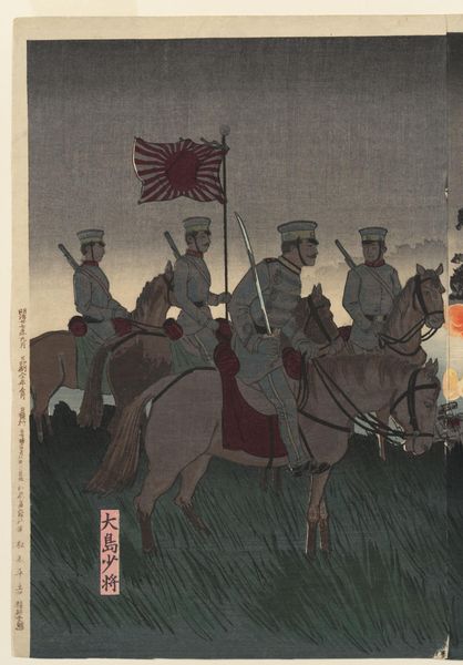 Curator: This print by Kobayashi Kiyochika, titled "Battle at Jinzhoucheng on the Road to Port Arthur," captures a moment of intense action. Editor: It’s stark, isn't it? The muted colors and bare trees give a sense of coldness and foreboding. The soldier in the foreground seems isolated, despite the troop behind him. Curator: Absolutely. Kiyochika’s use of light and shadow creates a dramatic effect, focusing on the individual soldier aiming his rifle. It speaks to the psychological weight of war, the singular act within the broader conflict. Editor: I see it as a calculated attempt to shape public perception of the Sino-Japanese War. These prints were widely circulated, serving as propaganda, glorifying military prowess. Curator: Yet there's a vulnerability in that isolated figure, a symbol perhaps of the individual's sacrifice within the larger narrative of national ambition. Editor: Perhaps, but these images also served to normalize violence, embedding militaristic values into the cultural consciousness. Curator: It's a powerful reminder that even images of conflict are laden with symbolic intent. Editor: And that art always plays a part in shaping the narrative of history.