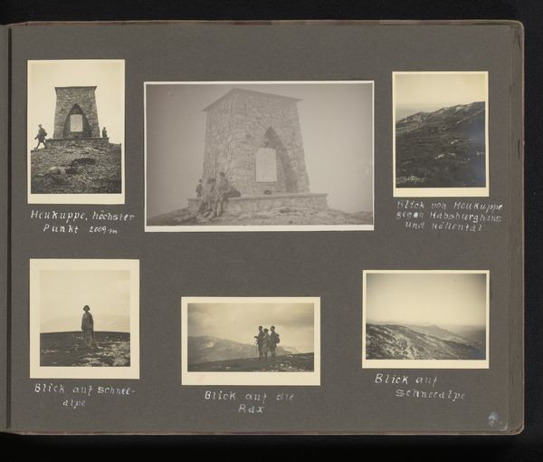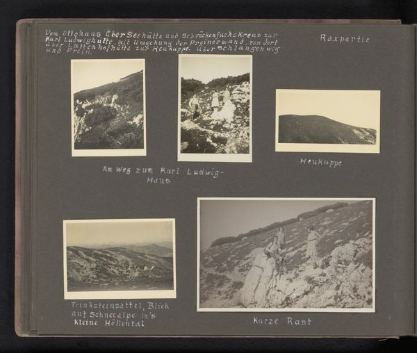 Curator: This image, entitled "Trektocht in de Oostenrijkse Alpen," offers a window into a personal experience of landscape during the 1930s, created by Berti Hoppe. The piece appears to be an albumen print documenting alpine scenery. What strikes you initially about this arrangement of photographs? Editor: Immediately, I’m drawn to the somber, almost oppressive atmosphere. The monochrome palette certainly contributes, as does the stark composition featuring domineering rock formations. There’s a sense of human insignificance when confronted with such monolithic, natural forces. Curator: Absolutely. Consider the period: Pre-war Europe grappling with political upheaval and anxieties about the future. The mountains aren't simply landscapes here; they become symbolic backdrops for grappling with feelings of both the sublime and, perhaps, a looming dread. There's a subtle tension between the individual's exploration and the weight of external circumstances. Editor: That’s interesting. I see the potential for those interpretations, particularly within the broader sociopolitical context of interwar Germany. The very act of documenting and archiving, as Hoppe has done by pasting them into this dark album, takes on an active role, a need to exert some control over what cannot be grasped. Curator: These photographs invite us to examine the historical gaze—the selective focus on certain vistas while omitting others. Why capture these specific angles of the Preinerwand or the Bismarcksteig? Does this represent a specific type of masculine experience of the Alps, a striving for the sublime? How do the named places contribute to a sense of identity and belonging, especially in a period of political instability? Editor: And also the small hints of civilization, too: the Karl Ludwig Haus. A meeting place for people. We should also not forget that these images would have held a very different valence then from what they signify today. These personal photos were later donated to museums, turning them into something entirely different from personal documents. Curator: Right, these intimate images gain new meanings as they enter the public sphere. The albumen print as an artistic medium itself represents an interesting blend of the scientific and the aesthetic. How might Hoppe's understanding of photography itself have shaped the narrative she constructed in the album? Editor: It seems that a careful consideration of visual codes helps in interpreting not just art, but also the complex ways social and political identity were perceived by the generation between the two World Wars. Curator: Exactly. It urges us to consider the personal archive as more than mere documentation; it becomes a site of cultural encoding.