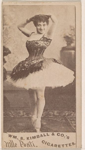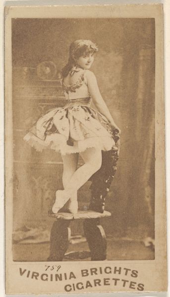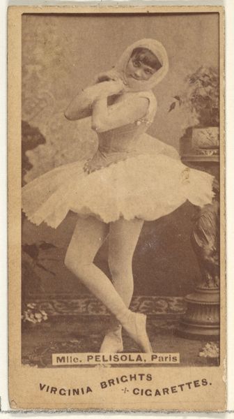 This is a trade card from the Actors and Actresses series made by Allen and Ginter. The card features Laus Eden in sepia tones, a delicate rendering of a ballerina en pointe. The composition is striking in its use of geometric forms. Eden's tutu creates a broad, symmetrical cone mirrored by the narrower triangle of her torso. This contrast in shapes, combined with her arched arms and legs, infuses the static image with dynamism, creating a sense of movement. Beyond representation, the image invites analysis as a sign. The ballerina, a figure associated with grace and lightness, is juxtaposed with the Virginia Brights Cigarettes logo. This tension between high art and commercial branding undermines established categories of value and taste. The card challenges fixed meanings and opens up a dialogue about the intersection of commerce, culture, and identity in the late 19th century. The photograph creates a play of surfaces and signs.
