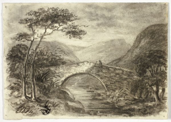 Curator: Immediately, I'm struck by how subdued this landscape is. It's like looking at a memory. Editor: Indeed. What you're observing is "Mountain Stream with Small Bridge II," a charcoal drawing made around 1855, housed here at the Art Institute of Chicago. Notice the artist's command over charcoal tonalities and how he uses them to construct a spatial recession. Curator: Yes, the texture of the charcoal definitely contributes to the melancholic atmosphere. But I can’t help thinking about the labour involved. The physical act of applying charcoal, smudging, and creating this whole vista must have been quite immersive, almost ritualistic. Editor: Precisely. Think about the paper too. Its rough texture almost merges into the foliage. How integral that physical interface is to its overall impact. You can also analyze how the bridge acts as a mediating structure within the landscape, both connecting and separating different zones in the composition. A metaphor of nature's duality, perhaps? Curator: It's about a human intervention, using material for the access across terrain, rather than simply admiring it from afar. Plus, it provides a structured plane amidst all the randomness of organic forms in the environment. You sense that there’s probably evidence to discover related to who constructed the bridge or how people crossed it. Editor: Interesting thought. Considering how the artist utilizes varying strokes, some blended, others quite distinct, the scene achieves an illusion of depth and realism that almost beckons us to delve further into this little valley. Curator: For me, it's the implicit tactile quality of the materials, the bridge's stonework and the grainy paper that provide it an honest and grounded experience to viewers. Editor: So, from considering material application to structured compositions, we’ve seen how even in a tranquil scene such as this one, both nature and creation work hand-in-hand. Curator: And how grounding an artwork like this can feel, considering the labor embedded into it, quite literally coming from dust to dust.