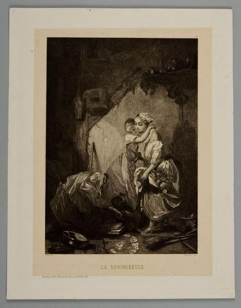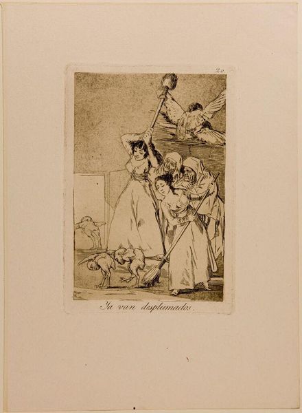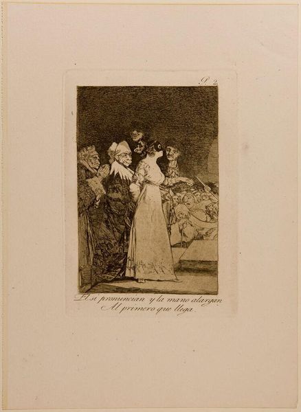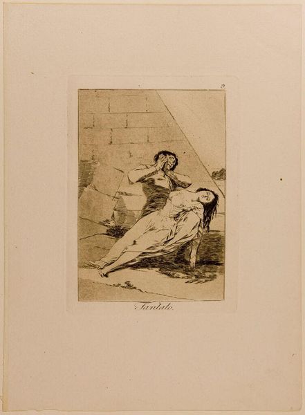 Editor: This print, “Hunting for Teeth” by Francisco Goya, depicts a rather gruesome scene. A woman is extracting teeth from a hanged man. What do you make of this scene? Curator: Well, consider the aquatint technique Goya employed. This process, involving acid etching, allowed for tonal variations that mimic the effects of wash drawings, thus softening the horror. But consider, whose teeth are these and what are they for? Editor: I hadn't thought about that. Curator: Teeth were valuable commodities. Were they being used for dentures, for the wealthy? Are the teeth symbols of class exploitation? Editor: That makes me see it in a completely different light. Thanks!