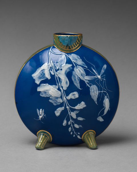 Editor: This vase, created by N.V. Haagsche Plateelfabriek Rozenburg in 1886, is crafted from multicolored-painted earthenware and adorned with flower motifs. The floral design gives it a charming feel, reminiscent of sunny meadows. How would you interpret this type of decorative artwork from a historical point of view? Curator: This vase represents an interesting intersection of movements. The decorative arts flourished in the late 19th century, fueled by industrial production and a burgeoning middle class eager to display its newfound wealth. It reflects a societal shift towards accessible art and beauty for the home. What is most fascinating about this piece is its blending of styles. Editor: You mean how it seems to incorporate the Dutch Golden Age despite it being Art Nouveau? Curator: Exactly. While Art Nouveau is evident in the floral motifs and sinuous lines, the Dutch Golden Age's influence surfaces in the object's overall structure and detailed artistry. The Hague was home to various ceramic manufacturers that competed fiercely with each other, especially concerning new artistic trends. How might this context inform your reading of this vase? Editor: Well, maybe the maker used these accessible "traditional" forms of beauty in this vase to communicate status in a more "common" visual language of that era? Curator: Precisely. Understanding this intersection tells us not only about artistic preferences, but also about class distinctions and how art served as a marker of social identity. It's also a reflection on what kind of art was valued by the museum-going or gallery-viewing public. Editor: I hadn’t considered the vase as a symbol of social class. It gives a much deeper understanding of decorative art from that period! Curator: Absolutely! Recognizing that the object and period serve as a dynamic meeting point reveals deeper contexts, social status, public and institutional artistic preferences, as well as how artistic choices mirrored and influenced a wider society.