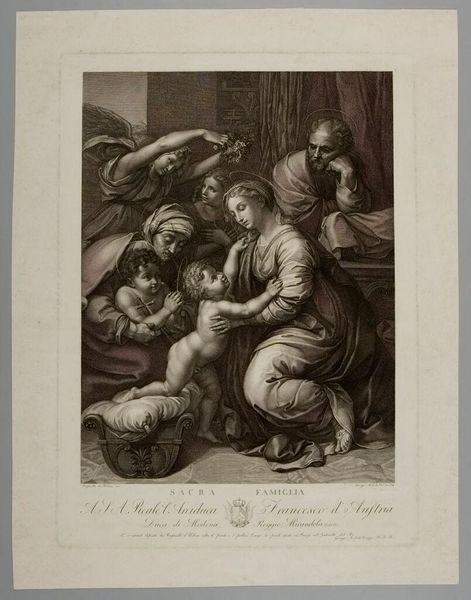 Curator: This engraving by Francesco del Pedro is titled "Music." Editor: It strikes me as a peculiar composition. The figures seem trapped between youth and age, joy and melancholy. Curator: Note the contrast in textures, from the boy's roughspun cap to the girl's delicate fabric. Consider how printmaking democratized art production. Editor: The girl holds sheet music. Notice how the repetition of notes evokes a sense of rhythmic order, a symbol of harmony against the backdrop of human transience. Curator: Yes, the labor of creating these reproducible images also made art accessible beyond elite circles, influencing social norms. Editor: I find myself pondering on the emotional narrative—innocence, fleeting beauty, and the inevitable presence of mortality. Curator: I'm more interested in how the production and consumption of these prints impacted the burgeoning middle class. Editor: Ultimately, it’s a poignant exploration of the ephemeral nature of beauty, isn't it? Curator: Perhaps. Or a testament to the power of reproducible art in shaping a broader culture.