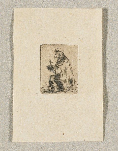 Curator: This is a work titled "Kind met een hond", or "Child with a Dog," created sometime between 1837 and 1865. It's an etching, using ink on paper, now held in the Rijksmuseum's collection, and the artist's profile is listed as Joseph Hartogensis. Editor: There's a definite sense of serenity, a quiet moment captured. The delicate lines of the etching really convey a gentle intimacy between the child and her dog, don’t you think? Curator: I agree. Works like this circulated widely, contributing to bourgeois values about family and the sentimental appeal of childhood, but also making art accessible. Editor: And think about the symbolism inherent in the child-animal bond! Dogs often represent loyalty, protection, a sort of innocent companionship. That visual motif became increasingly powerful across different forms of representation at this time. Curator: Exactly. Etchings, as a medium, allowed for greater distribution and democratization of imagery. This specific artwork feels particularly poignant given its genre scene; not only that but how Dutch genre paintings depicted family values at the time, and this work falls right into that context. Editor: What’s intriguing to me is how the dog seems to mirror the child in miniature— almost a psychological projection of innocence and obedience. Curator: Absolutely, and such representation was extremely popular and even considered part of the collective cultural education. These small etchings provided affordable entry points into this aesthetic. They shape perception and social ideas related to home life. Editor: I find the simplicity deeply affecting. It really boils down to fundamental themes of childhood and friendship. Curator: Yes, but even simple images carry their socio-political weight within their time. It’s important to recognize the dual impact: beauty and ideas both. Editor: A very lovely little snapshot. Thanks for bringing it to life. Curator: My pleasure. Analyzing even small pieces allows for an entire reconstruction of social beliefs and attitudes.
