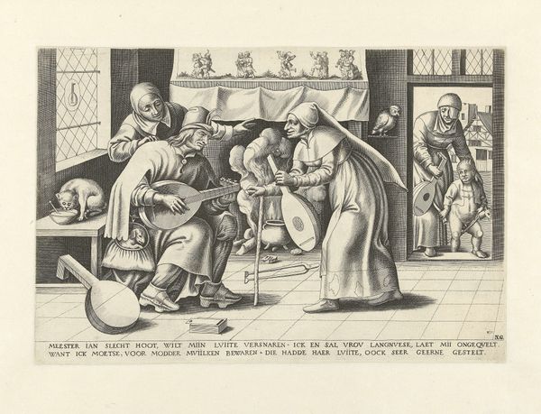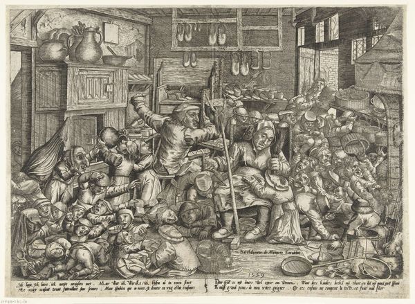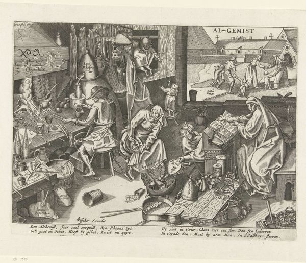 Editor: Here we have Philips Galle's "Alchemist," an engraving from around 1556-1560. The density of the image is really striking – it's crammed with figures and objects. How do you interpret this work, especially considering the social context it comes from? Curator: It's fascinating, isn't it? Galle's "Alchemist" isn't just a genre scene; it’s a commentary on the socio-economic anxieties of the time. Alchemy, while ostensibly about transforming base metals into gold, becomes a metaphor for broader societal aspirations and deceptions. The chaotic, almost frantic activity within the alchemist's workshop can be seen as a critique of striving for wealth and status. The contrast with the exterior scene hints at what’s sacrificed in that pursuit. Don't you see the commentary on value systems being presented here? Editor: That's a really interesting point. So you're suggesting the alchemist’s activities could be mirroring, maybe even mocking, larger power structures at the time? Curator: Exactly! Consider the power dynamics inherent in early modern science. Alchemy was a secretive, often unregulated practice. The idea of transformation held allure, but also raised concerns about social mobility and potentially disrupting the established order. How might this image speak to fears surrounding unregulated knowledge and its potential to destabilize society? Editor: I guess it does feel quite subversive, questioning who holds knowledge and the legitimacy of their pursuits. Curator: Right. Think about how this challenges traditional hierarchies by showing the futility of attempting shortcuts to wealth and power. Also, consider what it says about labor. The intense focus indoors versus the familial interaction outdoors speaks to an imbalance and cost of this relentless, if misguided, pursuit. Editor: So, seeing it this way transforms what seems like a simple depiction of alchemy into a critique of early capitalist desires and patriarchal control? Curator: Precisely. And recognizing this enriches our understanding of the era’s cultural anxieties about power, class, and gender. Editor: I've definitely got a lot to think about, and a wider perspective on how art and social commentary can connect.