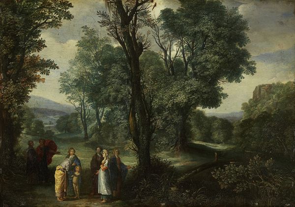 Curator: Pier Francesco Mola, dating his activity between 1632 and 1666, painted this captivating piece, “The Rest on the Flight into Egypt.” It currently resides at the Metropolitan Museum of Art. Editor: Wow, immediately, the sheer contrast! The dark, moody landscape sharply set against the luminous figures of Mary and Jesus... It feels incredibly intimate despite its rather epic scale. Curator: Indeed, it’s a moment of quietude plucked from a perilous journey, steeped in Baroque drama. What strikes me is how Mola intertwines the divine with the ordinary. Look at how he renders the landscape; it is idealized, but at the same time incredibly earthy and present. Editor: It's almost subversive, right? Taking this archetypal symbol of displacement – refugees, essentially – and placing them within a traditionally pastoral setting. Mary, in that saturated blue, is almost like a defiant beacon against the gloom. Curator: Absolutely, and that tension, that feeling of being both sheltered and exposed, amplifies the emotional depth of the painting. Mola’s brushwork here, so free and almost sketch-like in the background, builds towards this incredible level of detail around Mary and the Christ Child. Almost like, here's a place to find something, if one seeks it. Editor: The choice to depict Joseph somewhat in shadow also piques my curiosity. Considering the historical weight placed on the male figure, Mola seems to intentionally dim his importance in favor of highlighting the strength and resilience of Mary, as well as offering this unique bond between her and her son. It begs the question of divine agency, doesn't it? Like, who holds the actual power in this scene of flight? Curator: That's a beautiful point! And Mola leaves the question unanswered. What he masterfully gives is space, space for our own interpretation, for our own empathy. He truly transformed this history painting into something deeply human and full of grace. Editor: Looking at "The Rest on the Flight into Egypt" from a feminist lens, it showcases this image that provides refuge and resistance within a patriarchal framework. And I wonder what we would achieve by using art this way even now... Curator: Mola challenges the way we typically see idealized versions of what safety might mean—a space in-between chaos and tranquility... Maybe, with this, it serves as a poignant reminder of art's unique capability.