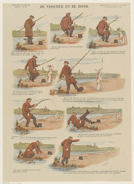 Curator: Firmin Bouisset’s lithograph, titled “Aan het strand”, or “On the Beach,” made sometime between 1876 and 1891, immediately presents a charming, almost naive, visual narrative. What's your first take? Editor: Well, it certainly exudes a sense of innocent play. The palette is subdued, almost faded, lending an antique charm to the sequential scenes of children at the beach, giving an overall mood that is pleasant but somewhat static in tone. Curator: Absolutely. Considering the historical context, this lithograph provides insights into leisure activities and childhood in late 19th-century Europe. The emergent middle class began to regard childhood differently. Editor: True. However, I'm particularly interested in the composition. It seems structured like a comic strip or a children's book illustration. The narrative unfolds through these separate panels showing the children interacting with each other, with toys, and most notably, with a crab! Curator: Indeed! Notice how Bouisset uses line and color minimally, yet effectively, to delineate forms and spaces. The subtle color variations lend depth while maintaining the flatness inherent in the printing process. Semiotically, each panel represents a discrete unit of meaning that, when combined, produces a simple but relatable tale. Editor: From a social history perspective, the inclusion of a fisherman interacting with the children tells of both opportunity and commerce within these new leisure spaces. How this moment is illustrated and represented is also of importance, presenting children, crab, and working class figures as interacting across the emerging social divides. Curator: Precisely! While seemingly lighthearted, it reflects evolving attitudes toward leisure and social dynamics. Editor: I am left considering how artists reflect, but also create the spaces and interactions as understood in collective memories and lived social relations. Curator: This lithograph indeed acts as a window into a bygone era, skillfully presenting not just its aesthetic values but a set of historically determined realities.