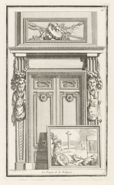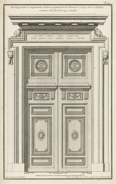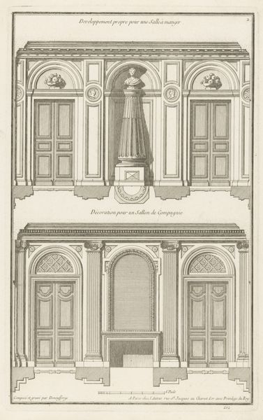 Curator: My first impression is: wow, this space looks a bit intimidating, like a room where serious discussions happen under the watchful eyes of classical busts. What's your read? Editor: It's interesting you say that. Actually, here we have Jean-François de Neufforge's 1760 engraving, "Kabinet en salon," currently held at the Rijksmuseum. This work contrasts a 'cabinet,' or study, with a 'salon,' showcasing distinct approaches to interior design in the Neoclassical style. The image is incredibly formal, focusing on structure and architectural elements rather than a lived-in feel. Curator: Intimidation isn't far off, it's definitely that "Don't touch anything!" vibe. But in an aspirational way? What pops out for you structurally? Editor: Precisely! Focus first on the symmetry and geometric precision. The top section displays a design for a cabinet—note the central relief panel, flanked by symmetrical framed portrait medallions. Then contrast that with the salon below, dominated by a central doorway and flanked by niches containing classical busts. The lines, rectangles, circles...it's all carefully plotted, isn’t it? Neufforge really wants to convey order and harmony, a real signature of neoclassicism. Curator: The doorways almost dare you to find the password to enter, that sort of thing, haha. Thinking about it, though, those busts downstairs almost feel like they're judging you before you even open the door, ha! Does this intense, rationalized space reflect, perhaps, an evolving mindset from the era, perhaps even something like, "Hey, maybe we can control the chaos?" Editor: It’s tempting to interpret the formalism through a socio-historical lens! In semiotic terms, these meticulously planned spaces, with their calculated arrangements and deployment of classical motifs, create meaning beyond just function. Think about it: this era sees a renewed interest in classical ideals of virtue, reason, and order, after all. Curator: It does feel a bit too controlled for actual living...like trying to fit wild thoughts into orderly boxes, perhaps? Despite that, it has made me pause and reconsider how space itself impacts how we create! I’m actually reconsidering redecorating. Editor: Exactly, and that's its power, even today. By focusing on the visual architecture, we can unravel how aesthetic choices mirror and reinforce cultural values—and that might inspire more thoughtful creating from us all. Thanks! Curator: Agreed—the conversation definitely reframed things for me! Always a treat!