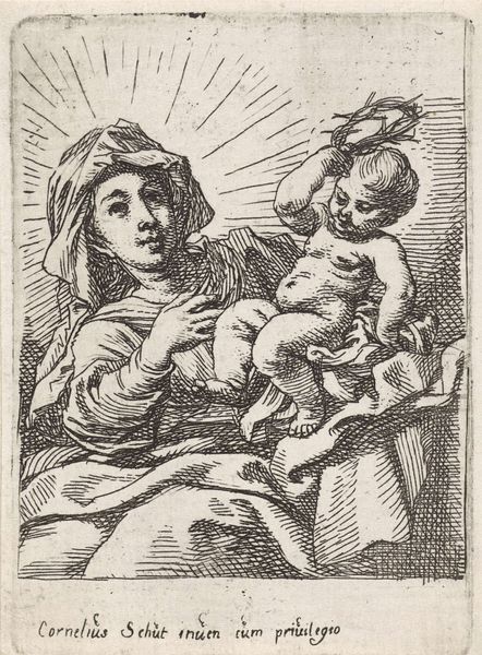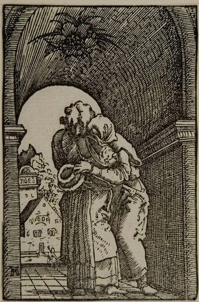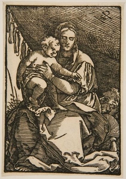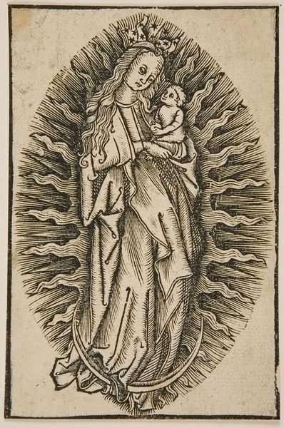 Editor: So this is Burgkmair's "Madonna and Child under an Arch." It's a woodcut. The lines are so precise, almost like engraving. What can you tell me about the making of this artwork? Curator: Consider the labor involved. Each line, a deliberate cut into the woodblock. The matrix itself, the wood, dictates the image in a way. How does the material of the woodcut, a more accessible medium than, say, painting on panel, affect the dissemination and consumption of this image? Editor: So the choice of woodcut is key to understanding its reach? Curator: Exactly! It democratizes the image, making it available to a wider audience through printmaking. Think about the social context: religious imagery reproduced and circulated, impacting belief through mass production. What does that tell you? Editor: I never thought about it that way - the meaning embedded in its production and distribution. Thanks.