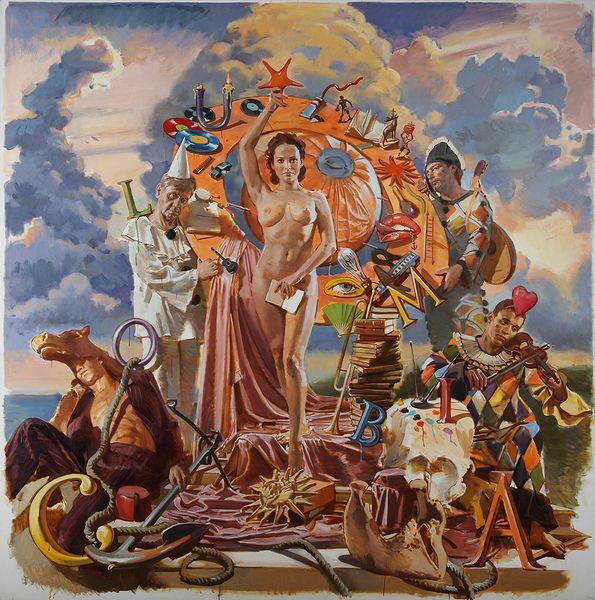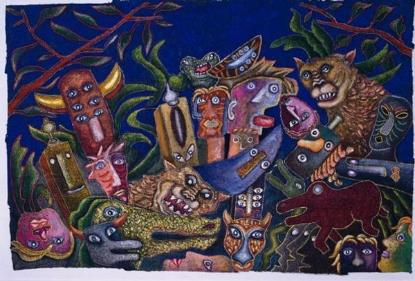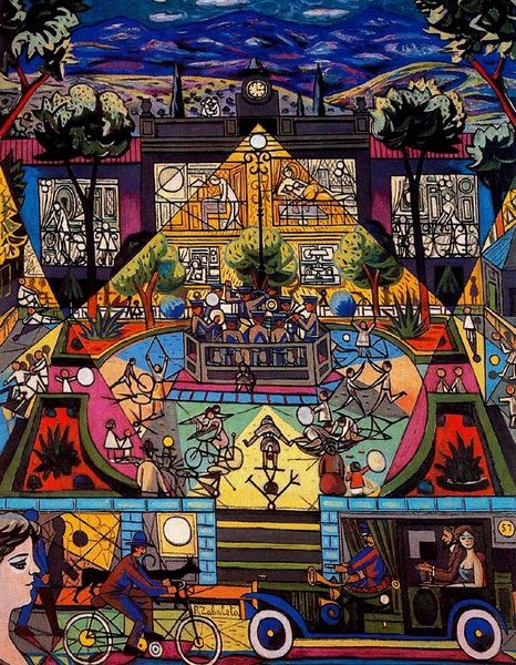 Editor: Diego Rivera’s “Pre-Hispanic America,” created in 1950, feels to me like an explosion of figures and forms across the canvas, seemingly without a central focus. What do you see in this piece? Curator: Initially, the high contrast draws the eye. Rivera uses vivid colors, deploying them to define each plane. Consider the interplay between the red figures on the lower left and the more muted tones of the mountainous landscape on the right. Does this tension enhance the composition, or does it detract from it? Editor: I find it challenging. There is no hierarchy. How do you read such chaotic arrangements of figuration, Professor? Curator: Perhaps "chaotic" is too simple. Consider how the architectural elements--the temple and the pyramid--intersect with natural motifs. There's a layering, a superposition of different systems. What does this juxtaposition communicate? Are we looking at harmony, contrast, or some form of critical dialogue? Editor: So, rather than seeing chaos, perhaps there's a structured conversation occurring on the canvas? The more you look, the more relationships appear, hidden within the texture. I see that there is organization within apparent chaos! Curator: Precisely. The eye needs training. Observe how Rivera's color palette echoes elements within both the "natural" and "cultural" sections of the mural; the red figure is of similar tone to the hummingbird. This creates unity and directs one to consider those relationships within the pictorial space. The arrangement speaks, what does it communicate, formally speaking? Editor: It really opens my eyes, and teaches me to think that sometimes, perceived disorder is precisely where one may find intricate interconnections. Curator: Art allows this kind of thought and it should, the exercise gives one the freedom to reflect on visual space as we reflect on existence.