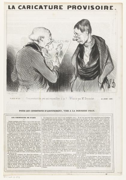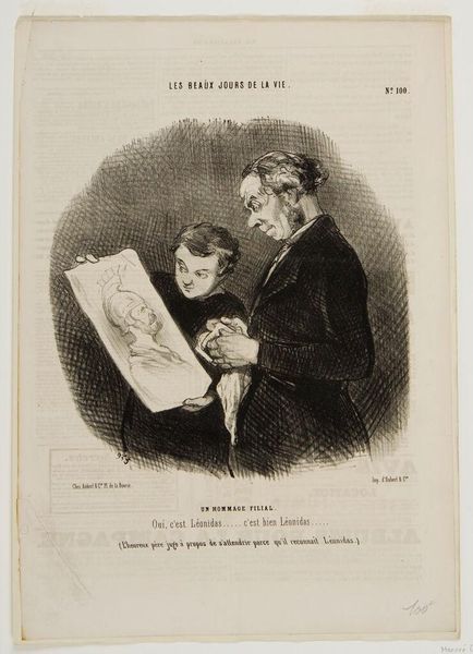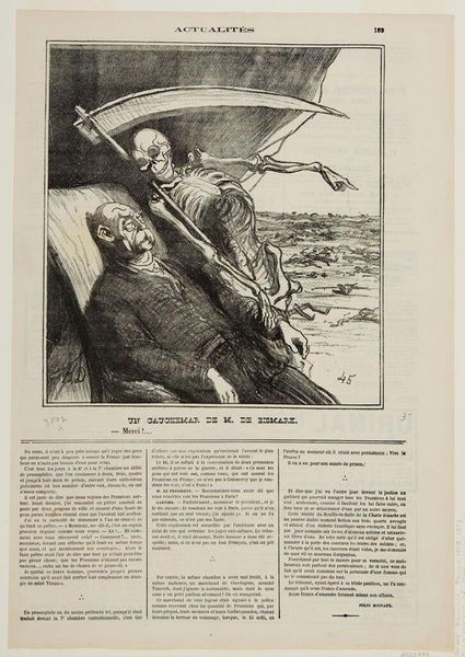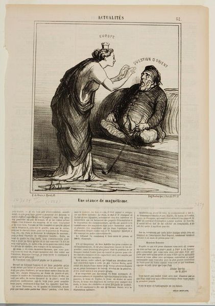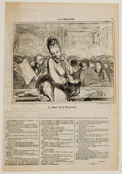 Editor: Here we have Honoré Daumier's lithograph, "The Consequences of a Horsemeat Dinner." The central figures, possibly a couple, seem quite disturbed. What can you tell me about the context in which Daumier created this piece? Curator: During the siege of Paris, horsemeat became a dietary staple. Daumier’s satire uses this social reality to comment on class and societal anxieties. Do you notice how he exaggerates the expressions of discomfort? Editor: Yes, it's quite striking! It feels like commentary on both culinary and social anxieties of the time. I hadn't considered the socio-political implications of food scarcity. Curator: Precisely. Daumier used everyday experiences to critique the political and social structures. It reminds us how art can reflect and shape public discourse.