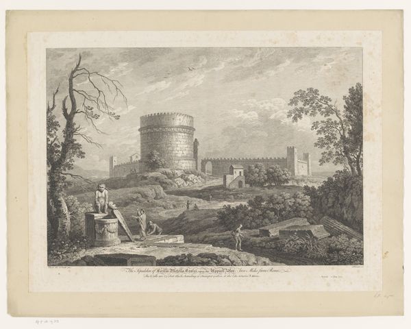 Editor: Here we have Robert Sayer's "View of Stirling Castle," made in 1753. It appears to be an etching with watercolor. The overall impression I get is one of serene stability; the castle dominates, but the muted palette creates a sense of calm. What do you make of this piece? Curator: Indeed. What immediately strikes me is the work’s tripartite composition. Sayer’s image presents us with distinct horizontal registers: a foreground occupied by diminutive figures and the sloping terrain, a middle ground dominated by the imposing castle walls and architecture, and a soft sky above. Do you see how each section offers different qualities? Editor: I see it now. The texture seems to shift from a rougher quality at the bottom with the brushstrokes of the grass and the people, to a more architecturally ridged area for the walls. And above it is all soft and smooth to represent the sky. Why do you think that is? Curator: Sayer creates emphasis through varied applications of media. Consider the sharp, precise lines that define the castle architecture against the softer washes describing the landscape. The formal tension created between precision and fluidity gives us a method to read this as a constructed versus a more wild terrain. Note how the people walking have even harsher lines separating them from the world. Editor: It’s amazing how much you can discern from these techniques. Is that typical for art from this time period? Curator: Certainly. These compositional elements, coupled with Sayer's choices in line, form, and color, point to an intentional structure to guide the viewer's eye, constructing not just an image, but also a structured way of seeing. It exemplifies the formal concerns that permeated the Rococo era. Editor: So, it's about the interplay between these elements to construct meaning. I think I see how this is such a structured format even though I was originally caught up by its soft colors. Curator: Precisely.