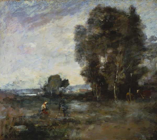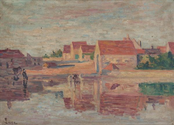 Curator: Looking at Walter Kurt Wiemken’s "Evening on the Seine," painted around 1930, what strikes you first? It’s an oil painting, quite small, likely done en plein air. Editor: A stillness. Despite the impressionistic brushstrokes, a very pronounced stillness. And an odd somber quality for a scene presumably about evening. It almost feels like a memory of an evening, rather than a depiction. Curator: The Seine, historically and culturally, certainly carries immense weight. It’s not just a river; it's a symbol of Parisian life, a witness to revolutions, artistic movements. Wiemken's choice, therefore, situates this work within that legacy, wouldn't you agree? The haze sort of hints it is both past and present. Editor: Absolutely. And while many artists celebrated the Seine as a bustling hub, this image emphasizes something more private, almost melancholic. The muted color palette—those grays and greens—it suggests a burdened reflection more than a vibrant cityscape. Perhaps reflective of some socioeconomic tension of the 1930's? Curator: Perhaps. One could delve into how Wiemken utilizes shadow and light here, couldn't one? Notice how the darker forms on the left – are those haystacks?– anchor the composition, contrasting with the ethereal glow of the sky, to the point where the landscape almost feels dreamlike, more about mood than precise detail. The impressionist label is a start, but not complete. Editor: Yes, I agree. The haziness, blurring the details; it transforms the river into a mirror reflecting internal feelings more than external reality. We aren’t shown people in leisure, pleasure. It hints at something more personal from Wiemken’s perspective. Curator: Which returns us to your initial impression. The image speaks to cultural memory, personal history intertwined with broader socio-political currents…it creates a contemplative experience. Editor: Right, it prompts us to consider how individual artists translate collective emotions, using familiar images to express profound interior landscapes. It invites a moment of solitary, even quiet, contemplation. Curator: Indeed, seeing beyond the immediate scene reveals how it becomes a portal to deeper psychological or historical reflection. Editor: Ultimately making even the quietest landscape a potent historical document.
