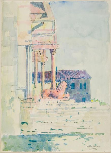 Editor: This is John Singer Sargent's watercolor, "The Terrace at La Granja," created around 1903-1904. I'm immediately struck by the way the light plays across the surface. It feels almost like a stage set, with those sphinxes acting as silent observers. What do you see in this piece, focusing on its formal aspects? Curator: Indeed, the stage-like quality is pertinent. Notice how Sargent employs horizontal and vertical lines to construct the space, creating a series of planes. The sphinxes punctuate this grid, serving as focal points. The limited palette of ochres, browns, and blues contributes to a sense of unity, yet there’s a distinct contrast between the solid forms and the washes of light and shadow. What purpose might this contrast serve, do you think? Editor: Perhaps it’s to draw attention to the texture and materiality? The smooth surfaces of the statues versus the rougher washes of watercolor? Curator: Precisely. The variation in application and texture provides visual interest and gives depth. Observe also how the negative space around the objects contributes to the overall composition, shaping the light and the void as equally important components. What conclusions can we draw about Sargent's aesthetic preferences here? Editor: He seems to favor capturing a fleeting moment with a focus on light and form, reducing objects to their essential shapes and textures. The speed of the watercolor medium lends itself to this immediacy. Curator: Yes, this showcases his ability to distill a scene to its fundamental visual elements and effectively convey them with minimal detail. It demonstrates a keen understanding of spatial relations and the expressive power of light and shadow, doesn't it? Editor: Absolutely. I see how his focus on the formal aspects creates such a captivating viewing experience, it goes beyond just representation. I never noticed all those planes and lines before! Curator: Analyzing the visual structure reveals the artist’s underlying intentions and aesthetic choices, providing a richer and more profound encounter with the artwork.
