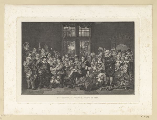 This is a photographic reproduction of a print, probably made after a painting by Adolph Tidemand. It shows a Norwegian wedding procession. Tidemand, active in the 19th century, was known for his romanticized depictions of rural Norwegian life. This image likely reflects his interest in portraying traditional customs. The wedding scene is filled with cultural references: traditional clothing, musical instruments, and specific gestures, like the collection of money as the couple enters their home. Prints like these played a vital role in disseminating images and ideas in the 19th century, shaping public perceptions of national identity and culture. By studying prints and paintings of this era, alongside texts and social histories, we can understand how these images were used to construct and reinforce notions of Norwegian identity, often in the face of modernization and urbanization.