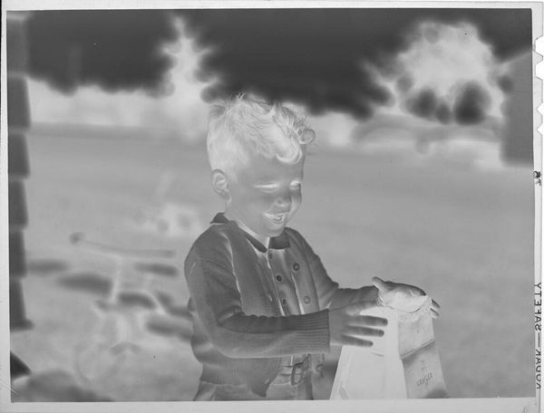 Curator: This is a photograph by Lucian and Mary Brown. It's called, simply, "Untitled (little boy holding puppy)." Editor: The first thing that strikes me is the tenderness. Despite the stark tonality, you can feel the gentle connection between boy and animal. Curator: This image is one of many, now housed at the Harvard Art Museums, that depict everyday life. Consider the Browns as chroniclers of their time. Editor: It's interesting, this moment they chose to capture. It feels staged, yet also deeply personal. What stories could this image tell about childhood and companionship? Curator: Absolutely. The Browns, through their lens, invite us to consider these relationships and what they meant during their time, but also what they still mean today. Editor: It’s an understated masterpiece. Capturing fleeting beauty so directly.