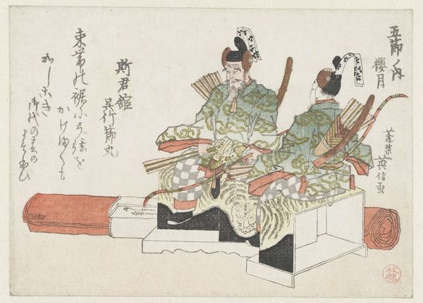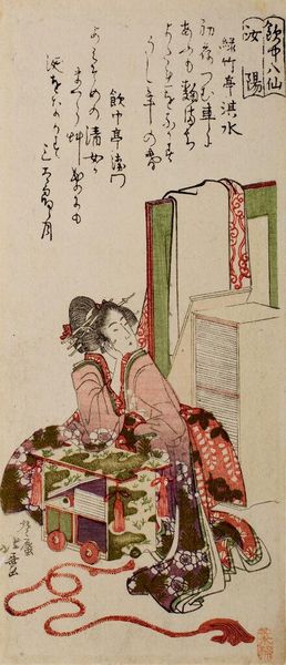 Curator: Katsushika Hokusai, an artist born in 1760, created "Bride with Sake Cup" as part of his Eight Drinking Immortals series. The print, made from paper, features a poem by Yamabe no Michitaka. Editor: The composition is striking—the bride's elaborate kimono dominates the scene. The color palette, although restrained, creates a mood of quiet celebration. Curator: Indeed. The print exemplifies the ukiyo-e style, reflecting the era's focus on transient beauty and pleasure, yet the poem suggests deeper cultural meanings related to ritual and tradition. Editor: I'm also intrigued by the deliberate asymmetry and the subtle use of negative space. It adds to the artwork's sense of contemplative grace. Curator: Precisely. The formal elements harmonize to evoke a profound moment of transition, imbued with the weight of social and historical expectations. Editor: It's a reminder that even in seemingly simple images, there is a convergence of personal expression and cultural narrative.