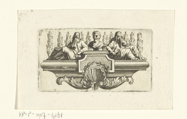 Editor: So, here we have a piece titled "Ontwerp ter herdenking van 100-jarig jubileum van De Grootnoordhollandsche van 1845 en Algemeene Friesche," which roughly translates to a design commemorating the 100th anniversary of some Dutch and Frisian organizations. It's by Carel Adolph Lion Cachet and was made sometime between 1874 and 1945 using drawing and watercolour techniques. It feels like looking at a ghost; ethereal figures emerging from toned paper. What do you make of this work? Curator: It’s fascinating, isn't it? It whispers rather than shouts. Looking at the composition, five figures are almost spectral, standing in a shallow space like figures carved into a monument— a monument existing only in a dream. Cachet’s choice of watercolour, particularly its translucent quality here, almost feels like an elegy. Makes you wonder what exactly about the centenary moved him to this wistful imagining. Does it evoke a similar feeling for you, or do you see something different? Editor: Definitely the same wistful feeling, almost melancholic. The light pencil work only adds to that sense of fragility, like a memory fading. It’s also interesting how incomplete it feels; it's clearly a preliminary sketch. Curator: Exactly. And that incompleteness is key, I think. We see the artist's hand, the initial thought processes laid bare. It's raw, immediate. Almost as if the act of remembering itself is fleeting. I wonder about those organizations and the weight of a century lived, the human experience, right? What if all that remains is a light sketch, a watercolour whisper? The design's ethereal qualities suggest an appeal to nostalgia while grappling with how history itself becomes fragile. Editor: So true, thank you, that perspective really opened up new levels of meaning. It really emphasizes the act of memory and how things are forgotten with time. Curator: And that is art - it speaks even through a light pencil stroke, right? Always fascinating.